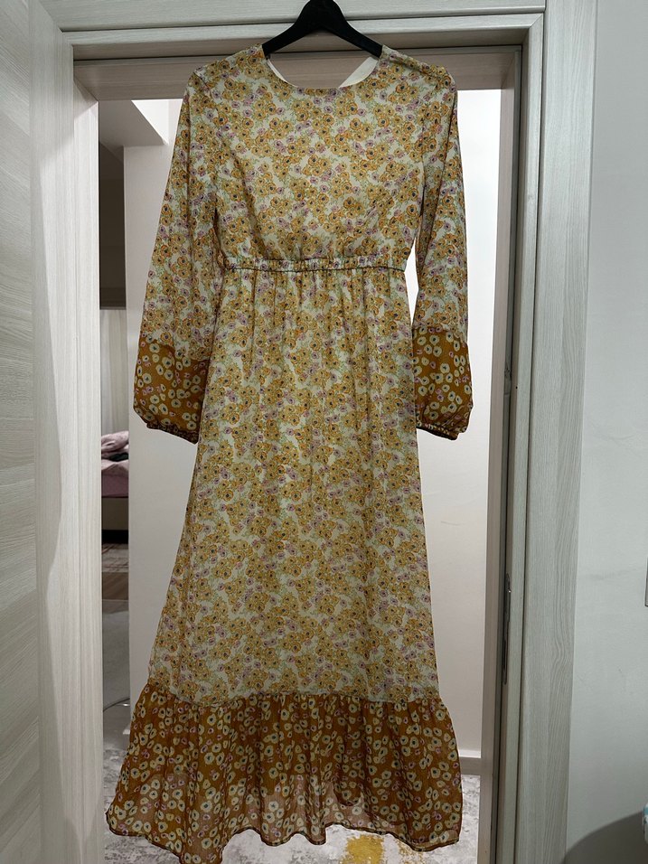 Açık bej renkli, çiçek desenli uzun elbise. Uzun kollu, yuvarlak yakalı ve bol kesimdir. Etek kısmında fırfır detayı vardır.hiç kullanmadım defosu yok