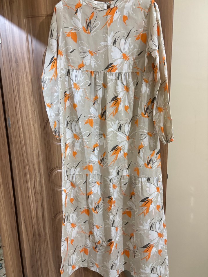 Bej renkte, uzun kollu, bol kesim ve kayık yaka bohem tarzda çiçek desenli, pile detaylı uzun elbise.