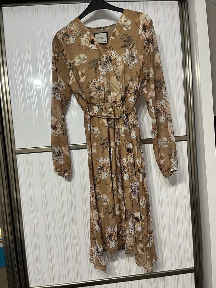 Bej renkte, uzun kollu, bol kesim, kemerli ve çiçek desenli bohem tarzı uzun elbise. Sentetik kumaştan üretilmiştir.