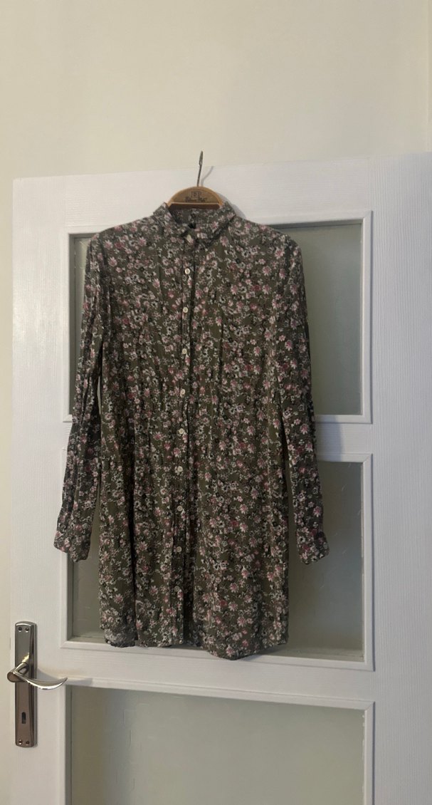 Bej renkli, çiçek desenli hamile tunik. Yüksek yakalı, uzun kollu ve düğmeli önüyle rahat bir kesime sahip. Günlük kullanım için bohem tarzda, yumuşak keten kumaş.