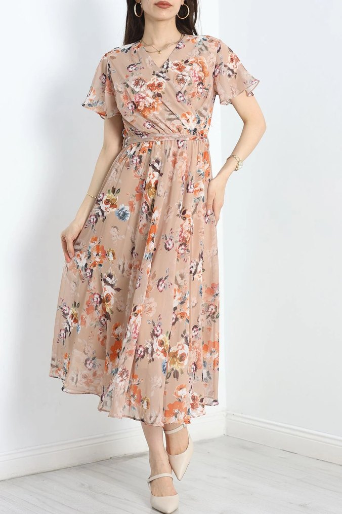 Bej Çiçekli V Yaka Uzun Bohem Elbise