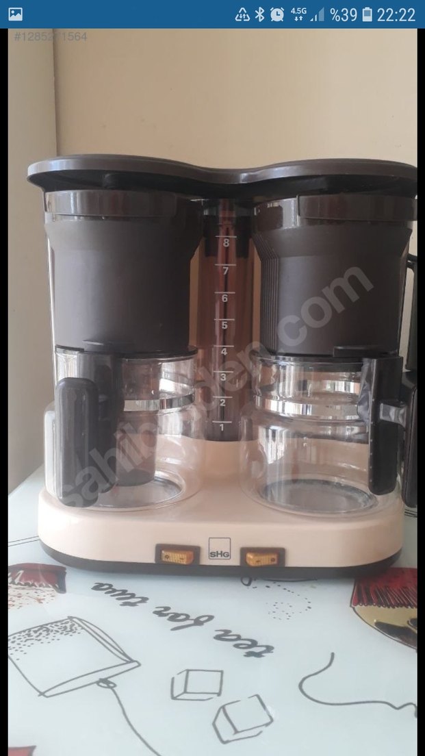 Bej renkte, iki cam demliği ve su seviyesi göstergesi bulunan kahve makinesi. Her taraf için ayrı açma/kapama düğmeleri vardır. ☕