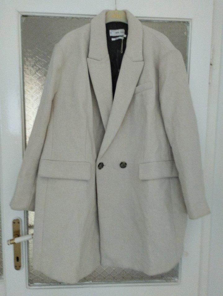 Bej çift düğmeli kaban, geniş yakalı ve kapaklı ceplidir. Klasik ve sıcak bir dış giyim seçeneği sunar. koltuk altı 76 cm/ boy 83