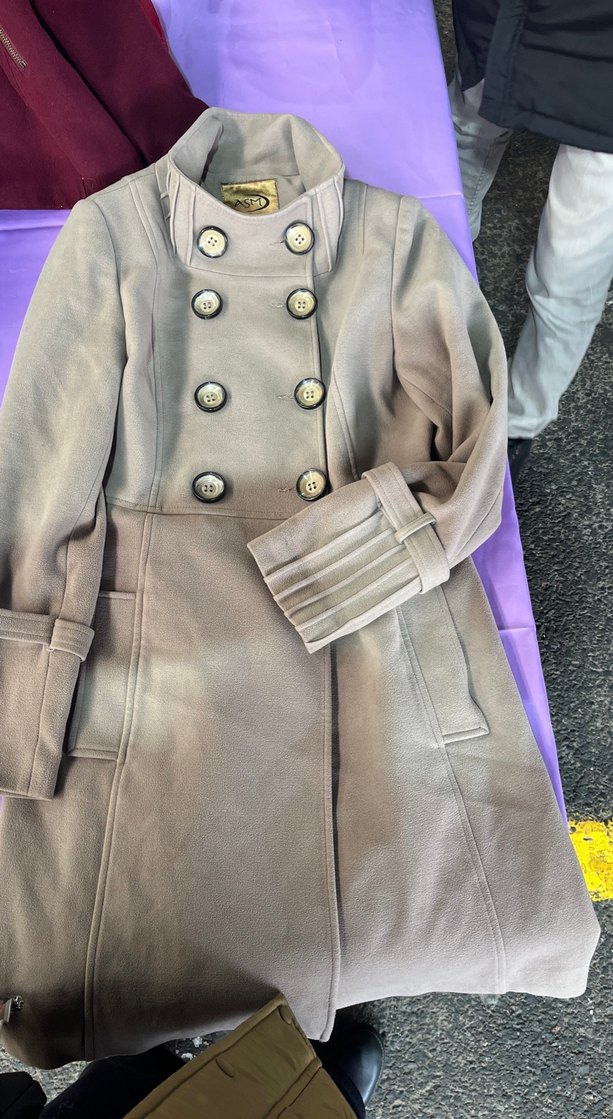 Bej renkli kadın kaban, çift sıra düğmeli ve yüksek yakalıdır. Uzun kollu, detaylı manşetlere ve yan ceplere sahiptir. Yumuşak ve sıcak tutan kumaştan yapılmıştır.