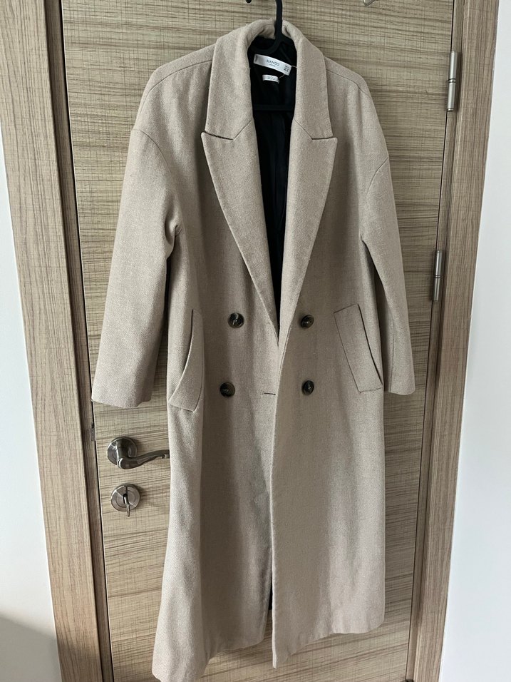 Bej renkli, çift düğmeli uzun kaban, klasik yaka ve yan ceplere sahiptir. Yumuşak ve sıcak kumaştan üretilmiştir.