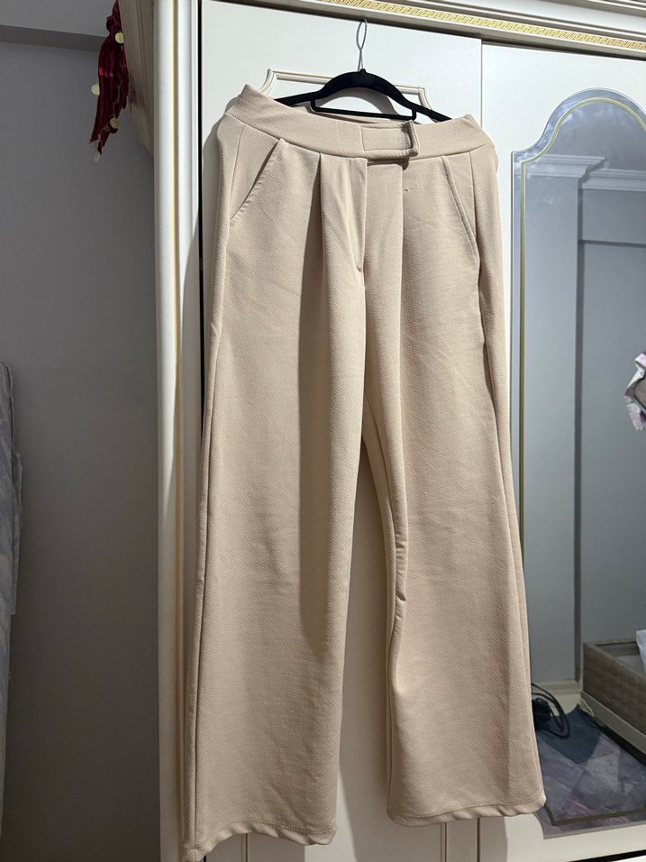 Bej renkli, bol kadın pantolon. Minimalist ve rahat ofis kullanımı için uygundur. Günlük kullanıma uygun