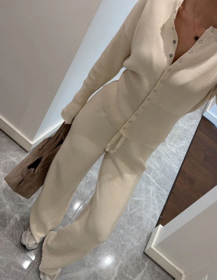 Hafif bej tonlarında, , rahat kesimli ve düz paça kadın pantolon, yumuşak sentetik kumaştan üretilmiştir.