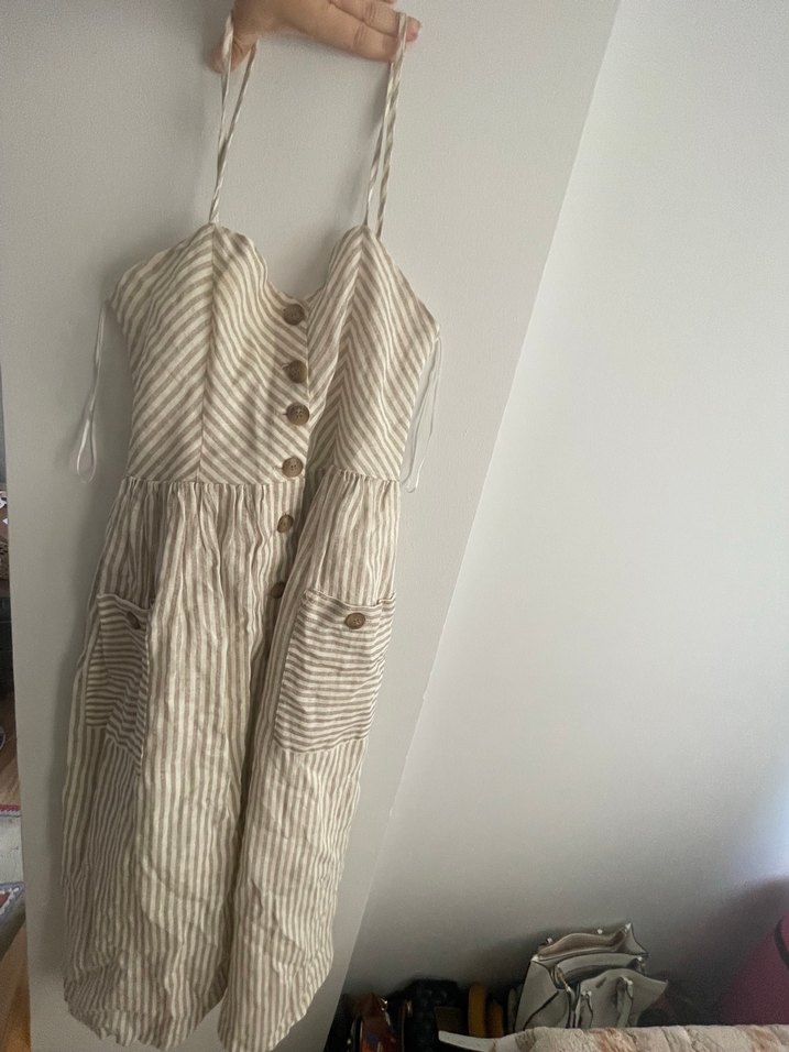 Bej çizgili keten midi elbise, askılı ve straplez yaka tasarımıyla düğmeli ön detaylara sahip. Rahat kesimi ve iki cep ile bohem tarzda, günlük kullanıma uygun. S beden ancak rahat kesim, 38 bedene hatta 40 bedene de olur eteği kiloş gibi. Orijinal mango. Güzel günlere kullanılsın
