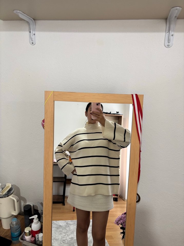 Bej renkte, çizgili, boğazlı uzun kollu triko. Rahat kesimi ve midi boyu ile günlük kullanıma uygun, minimal ve şık bir görünüm sunar.