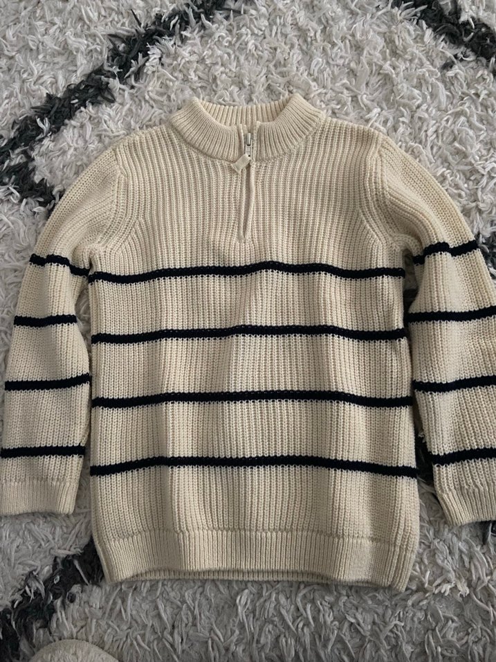 Boğazlı ve uzun kollu, bej renkli çizgili triko kazak. Rahat ve günlük kullanıma uygun, vücuda oturan kesim.
