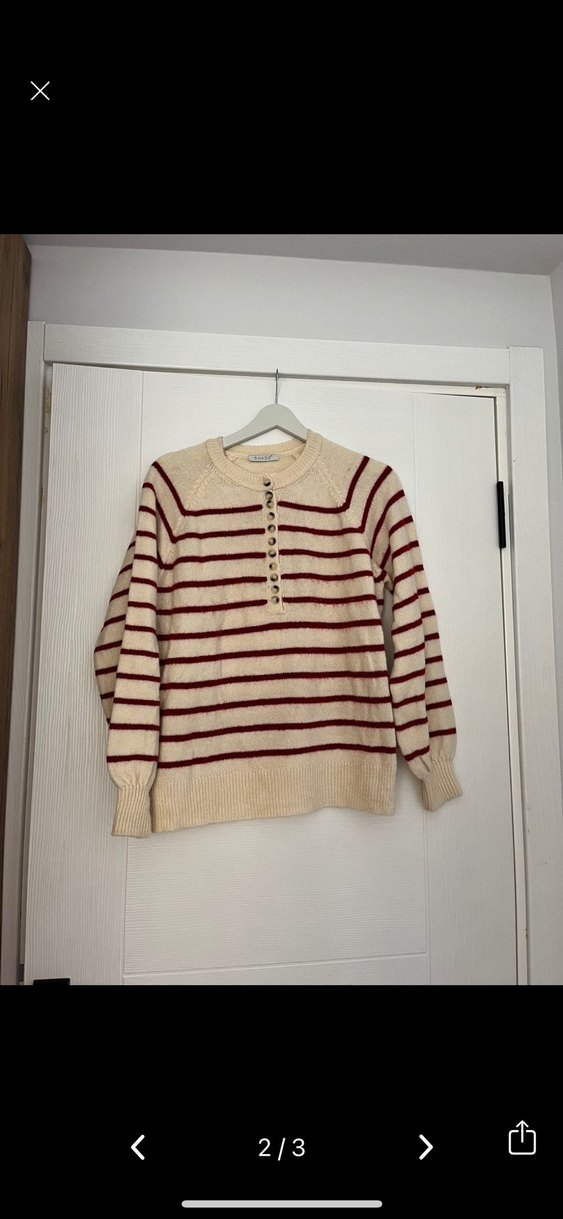 Bej renkli, uzun kollu ve düğme detaylı yuvarlak yaka triko kazak. Salaş kesimi ve çizgili deseniyle bohem tarzını yansıtır.