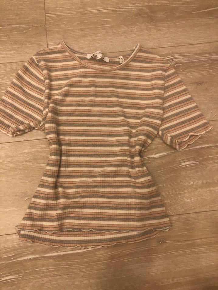 Bej renkli çizgili, kısa kollu, yuvarlak yaka, bol kesim örme kadın tişörtü. Bohem tarzda günlük kullanıma uygun.