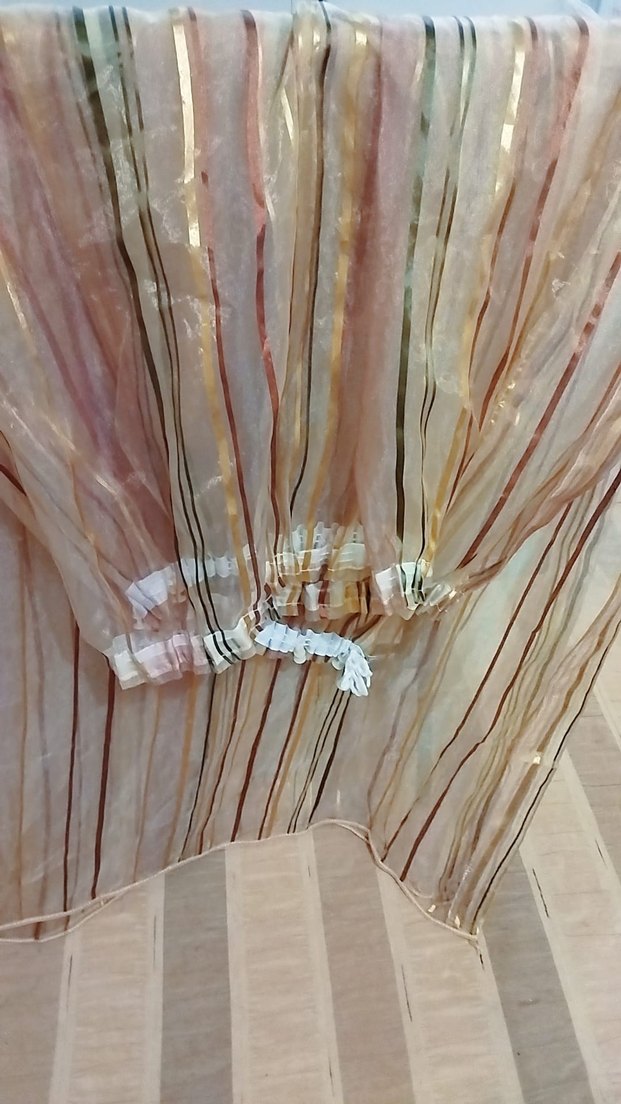 Bohem tarzda, ince çizgili bej perde. Hafif ve şeffaf kumaşı ile mekâna yumuşak bir dokunuş katar. eni 1.40 boyu 2.50