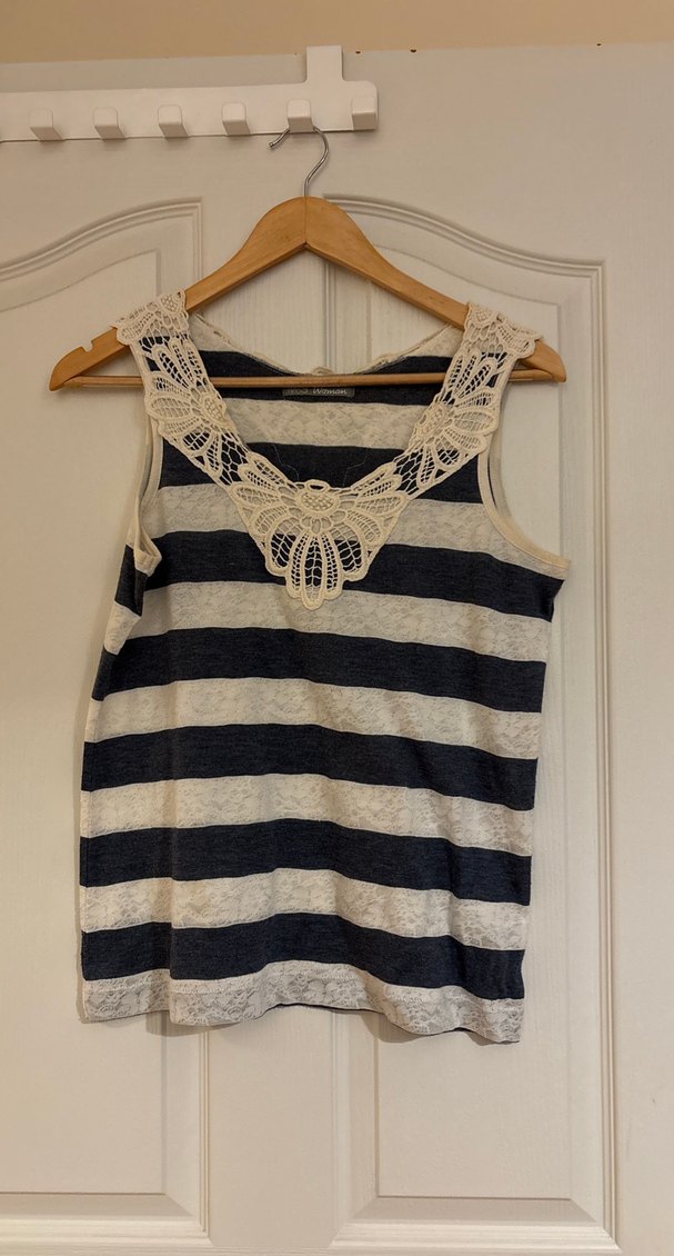 Bej ve gri çizgili, dantel detaylı, kayık yaka ve kolsuz triko kadın atlet. Rahat kesimli, midi boy, bohem tarzda günlük kullanım için uygun.