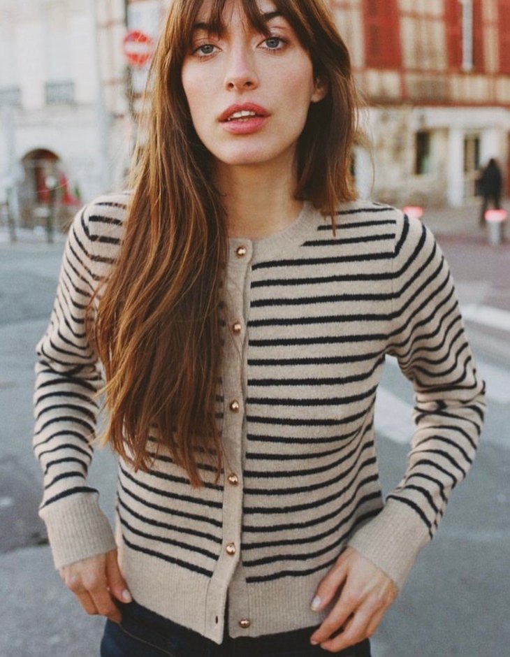 Bej Çizgili Düğmeli Kadın Hırka