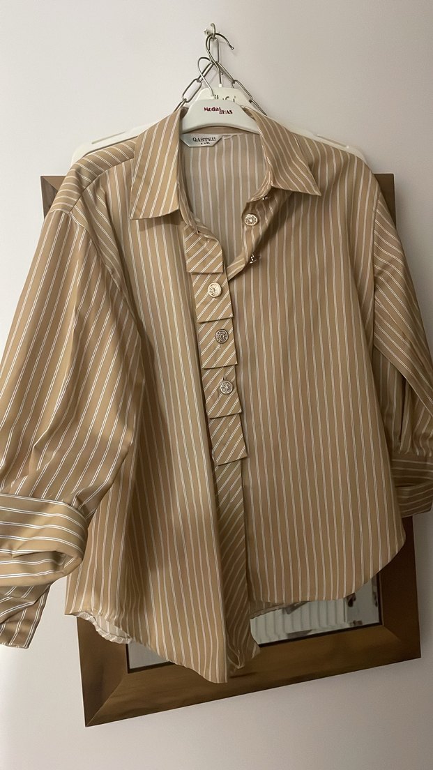 Bej renkte, keten kumaştan yapılmış, çizgili ve düğmeli uzun kollu, normal boyda, bol kesim kadın gömleği. Ofis kullanımı için uygundur.