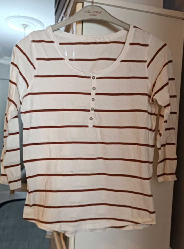 Pamuk kumaştan, düğmeli ve uzun kollu, bej renkli çizgili tişörtü sorunu yok tertemiz
