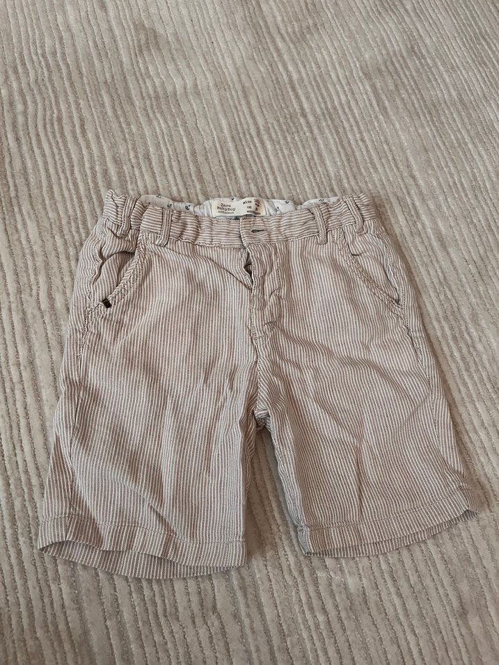 Bej renginde çizgili, keten kumaştan yapılmış, düğmeli ve bol kesim erkek şort, rahat sokak stili için uygundur.