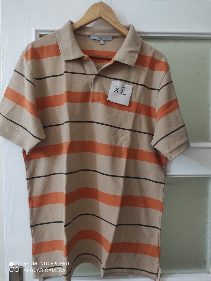 Kısa kollu, polo yaka erkek tişörtü. Sentetik kumaştan, bol kesim. Bej ve turuncu yatay çizgili, günlük sokak stili için uygun.