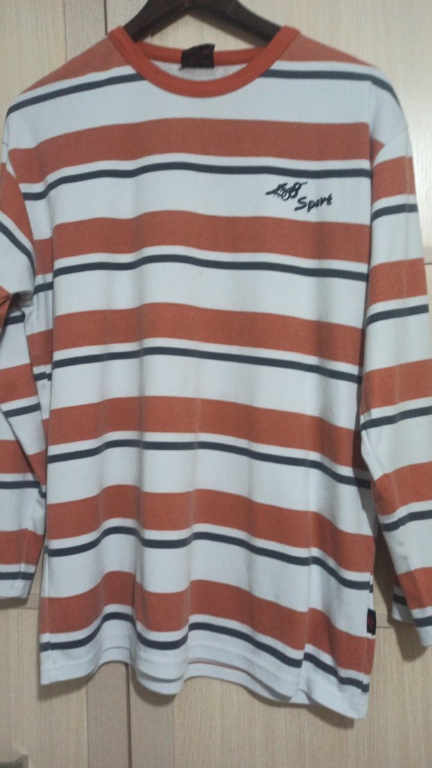 Uzun kollu, bisiklet yaka ve bol kesim erkek sweatshirt. Pamuktan örülmüş, bej tonlarında çizgili desene sahip, rahat sokak stili.