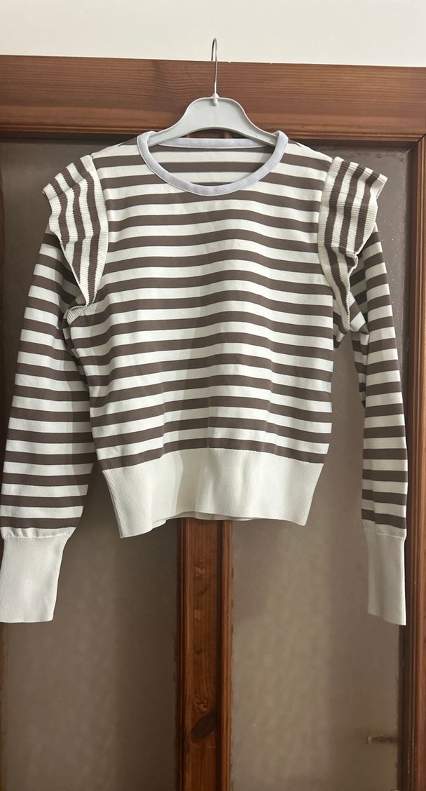 Bej ve gri çizgili, uzun kollu, yuvarlak yaka ve omuzlarda fırfır detaylı, sentetik kumaştan üretilmiş, vücuda oturan kadın kazak. Trendy ve günlük stil için uygundur.