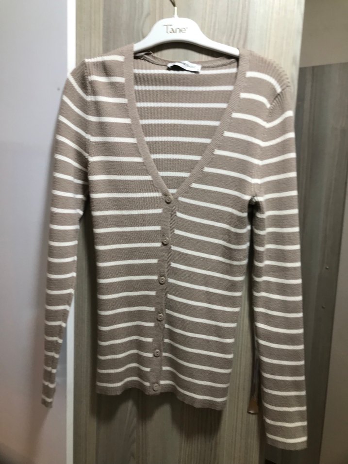 Bej ve beyaz çizgili, düğmeli ve uzun kollu, ince triko hırka hiç giyilmedi