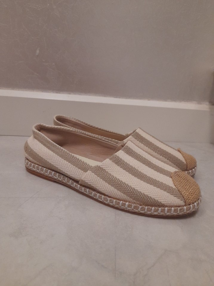 Sentetik kumaştan yapılmış bej çizgili espadriller. Günlük kullanım için uygun, bohem tarzda ve pileli tasarıma sahiptir.