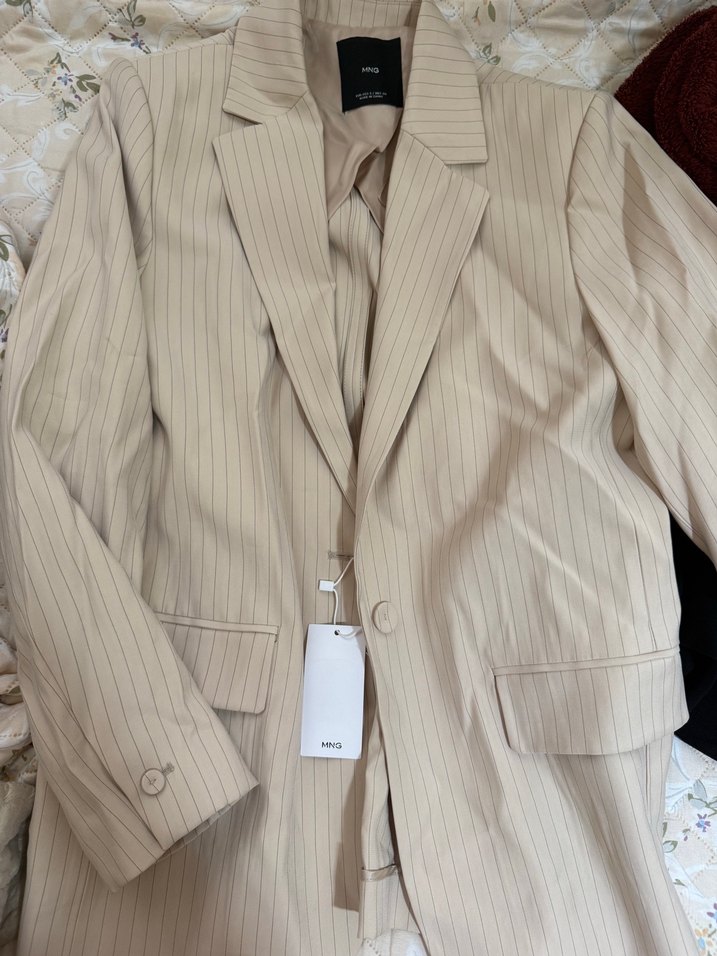 Bej renkli, çizgili, keten kumaştan yapılmış kadın blazer ceket. Notch yakalı, düğmeli ve uzun kolludur, normal kesimle ofis için uygundur. ✨