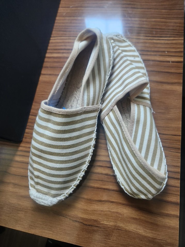 Yumuşak tekstil malzemeden yapılmış, bej çizgili ve dolgu topuklu espadril. Pileli tasarımı ve bohem tarzıyla günlük kullanıma uygundur.