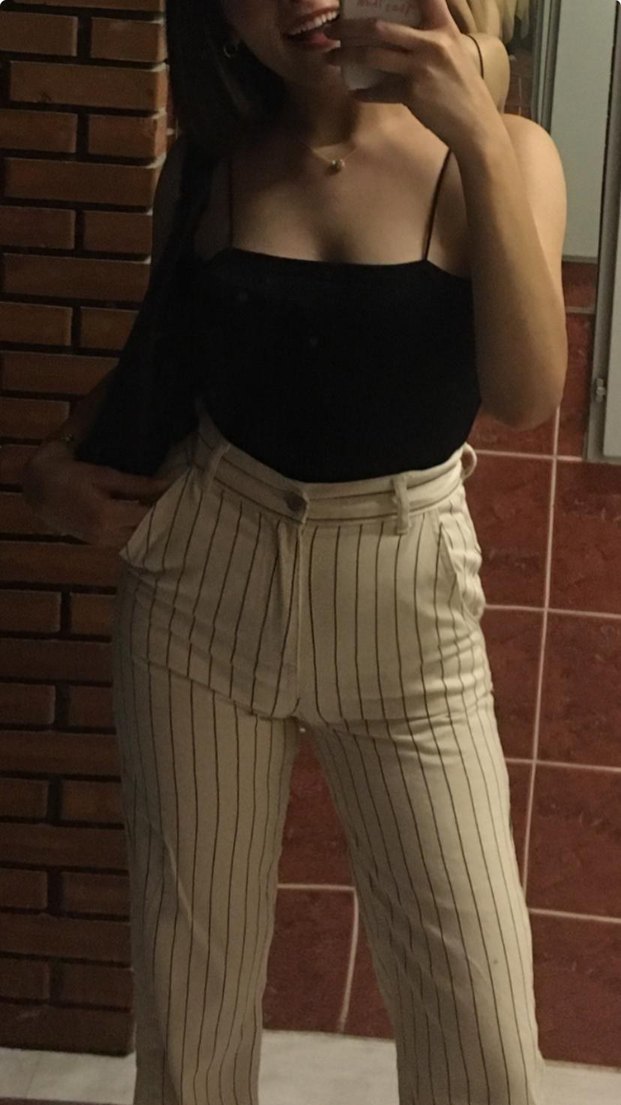 Bej çizgili pamuklu kumaştan, kadınlar için midi boy, fitted kesim pantolon. Günlük kullanıma uygun, zahmetsiz şıklık sunar.