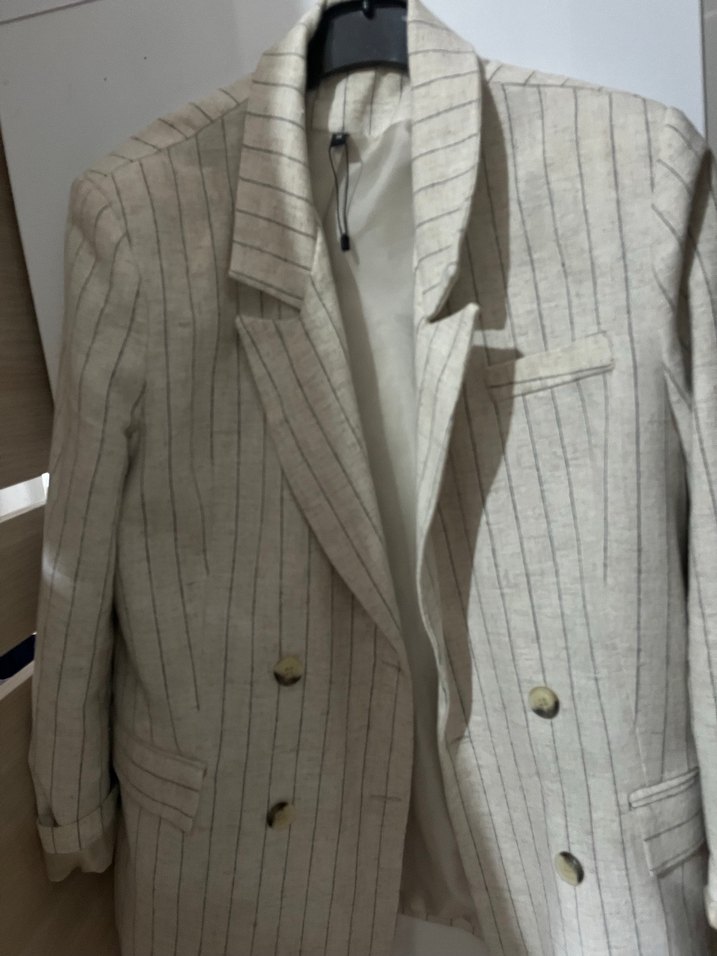 Uzun kollu, bej renkli keten blazer ceket. Düğmeli ve normal kesim, ofis ve günlük sokak stili için uygundur.