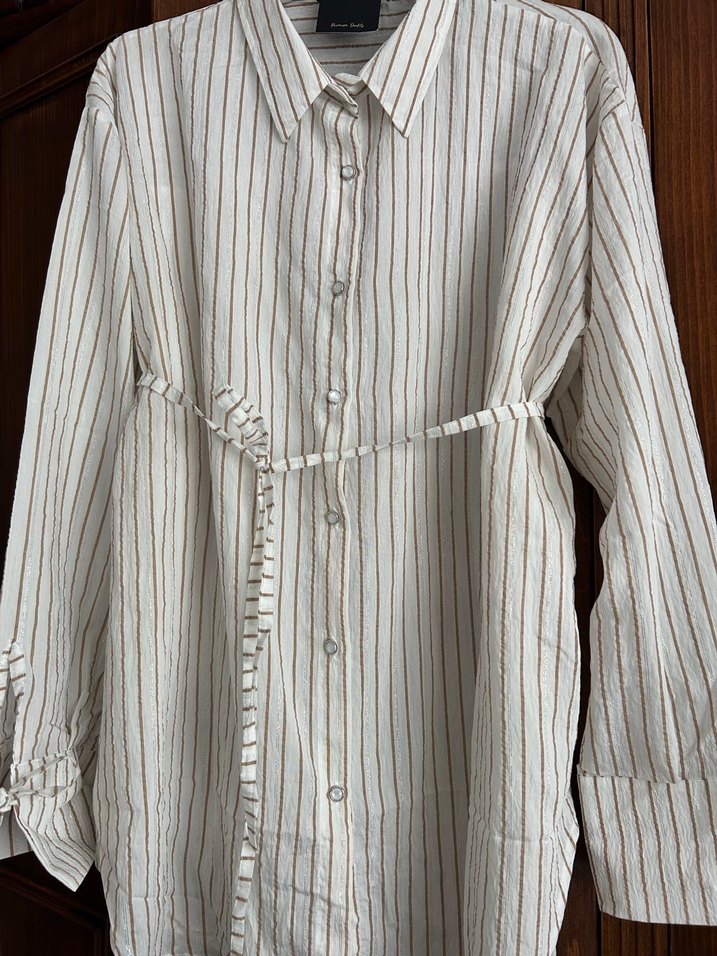 Bej ve gri çizgili, keten kumaştan, düğmeli, yakalı, uzun kollu, bol kesim kadın gömleği. Belden bağlamalı, rahat bohem tarzı.