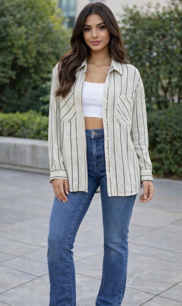 Bej Çizgili Kadın Keten Gömlek