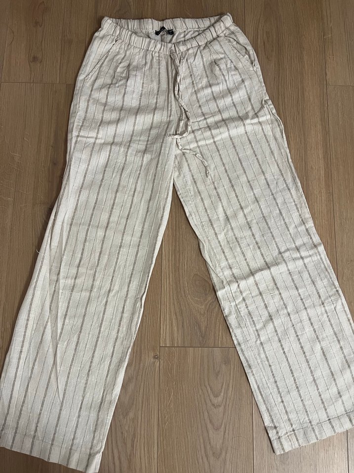 Bej çizgili keten pantolon, göründüğü gibi beli bağcıklıdır