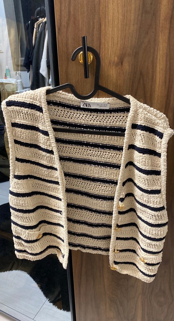 Bej ve lacivert çizgili, kolsuz, gevşek kesim triko hırka, günlük rahat kullanıma uygun. Sadece bir kez kullandım.