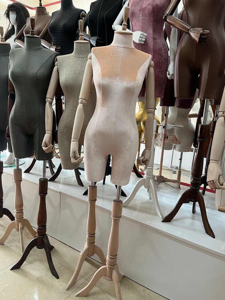 Dikey çizgili bej kadın manken, hareketli ahşap kollara ve sağlam ahşap tabana sahiptir. ♀️