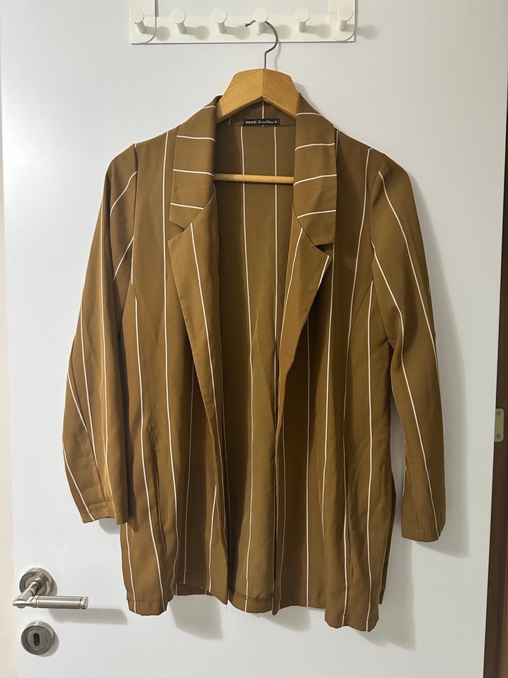 Bej çizgili midi ceket, uzun kollu ve kesik yaka detaylıdır ince kumaştan üretilmiş, ve regular fit modeldir. Hiçbir kusur yoktur. S-M uyumludur