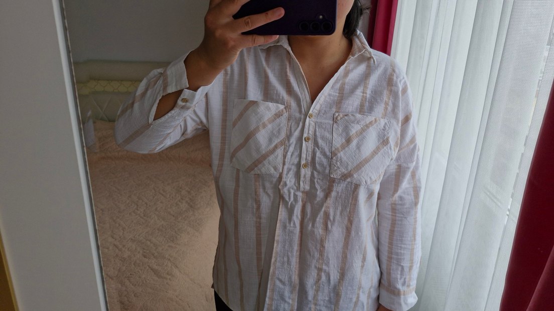 Açık bej çizgili pamuklu gömlek, yakalı ve düğmeli. Uzun kollu, bol kesim, günlük sokak tarzı için uygun. M beden oversize 40 bedene kadarda uygun sıkıntısız Ürün