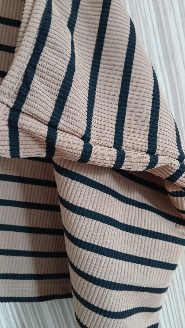 kahverengi ( resimde renk bir tık soluk çıkmış, kolay kombinlenebilir bir renk)tonlarda çizgili, plise detaylı, tekne yakalı ve vücuda oturan kadın triko. Rahat ve şık sokak stili için uygundur.