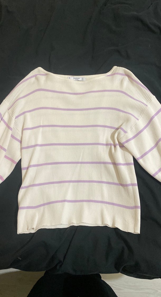 Bej ve lila çizgili, pamuklu, triko, uzun kollu, salaş kesim kadın bluz. Günlük sokak stili için uygundur.