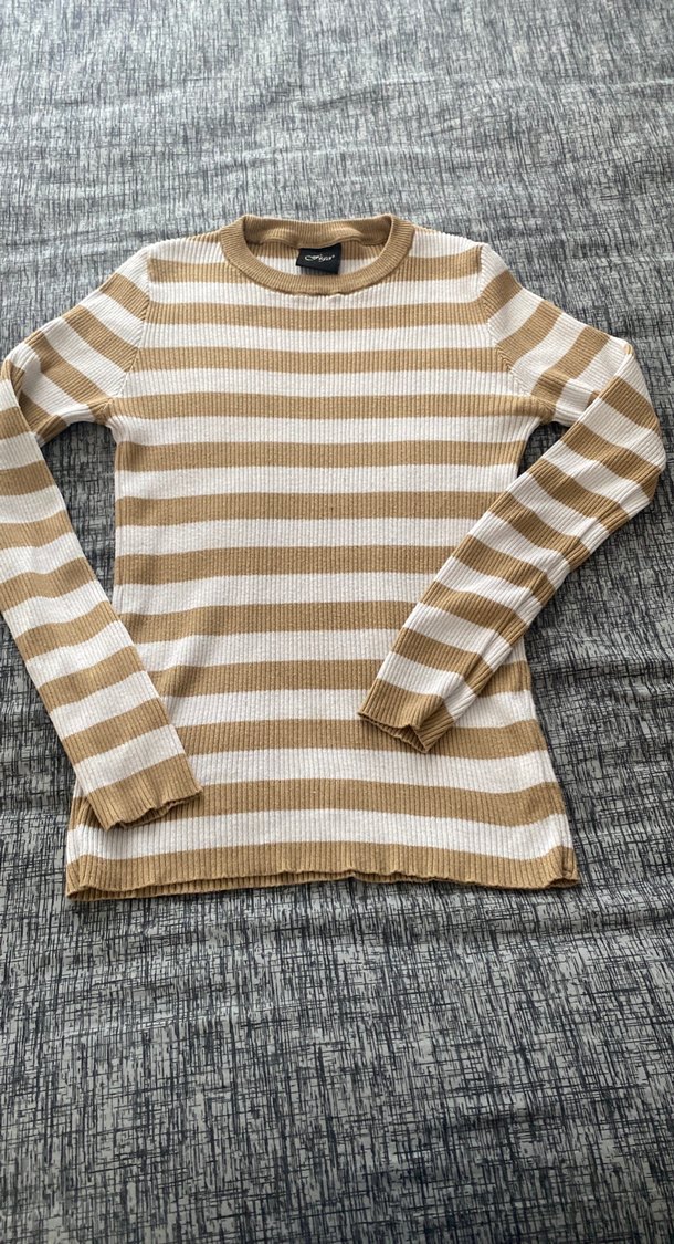 Yumuşak yün kumaştan yapılmış, bej ve beyaz çizgili, uzun kollu, bisiklet yaka, vücuda oturan kadın triko kazak. Günlük kullanıma uygun, rahat ve sade tarzda. S-m beden olur