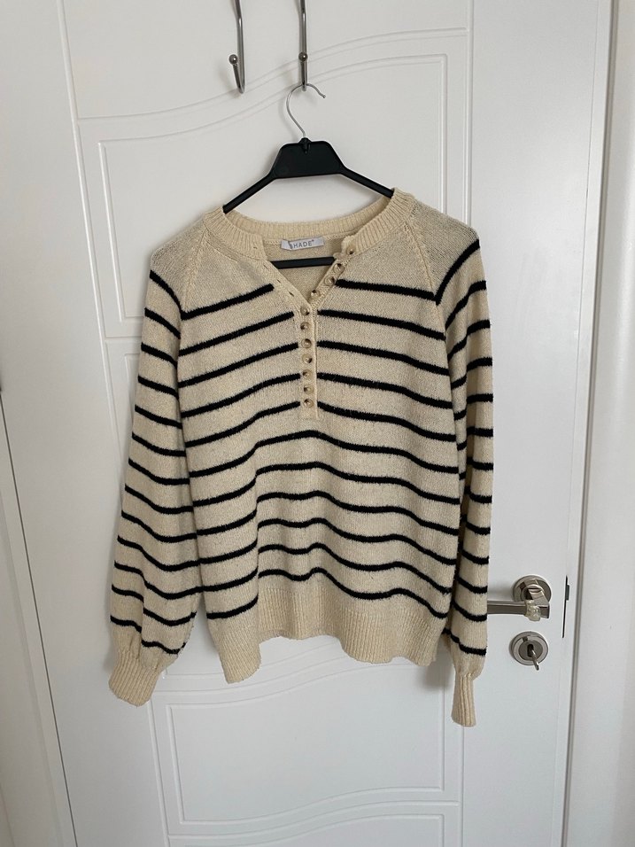 Bej renkli, uzun kollu, düğmeli yakalı ve çizgili desene sahip rahat kesim triko kazak. Günlük kullanıma uygun, konforlu bir model.