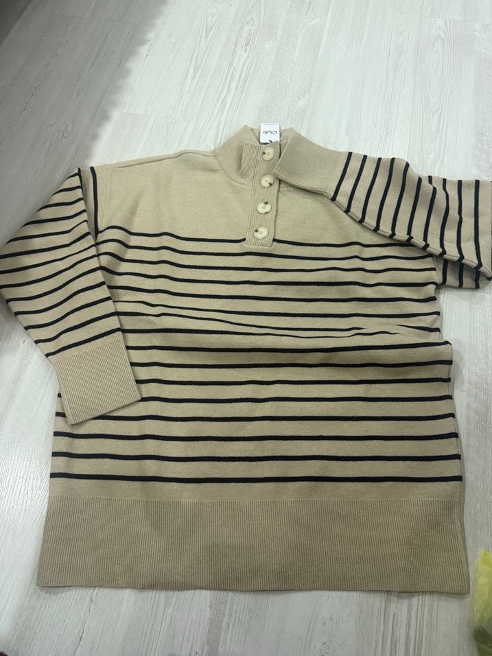 Bej renkli, uzun kollu, düğmeli yüksek yakalı, çizgili ve bol kesim kadın triko kazak. Günlük rahat kullanım için uygundur.