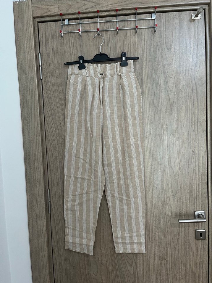 Bej çizgili keten kumaştan, kemerli, bol kesim, yüksek bel ve midi boy kadın pantolon. Günlük kullanıma uygun, rahat ve şık bir sokak stili parçası.