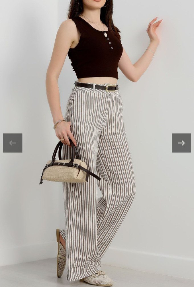 Bej Çizgili Kemerli Kadın Kumaş Keten Pantolon