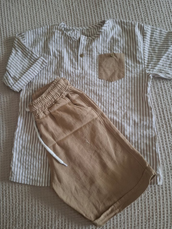 Çizgili, düğmeli, yuvarlak yaka keten üst ve bej keten, lastikli ve bağcıklı şorttan oluşan cocuk erkek takımı. 8 9 yaş uyumlu