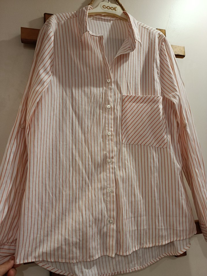 Beyaz renkli keten gömlek, uzun kollu ve yakalıdır. Düğmeli ön kısmı ve çizgili deseniyle rahat, bohem tarz sunar.