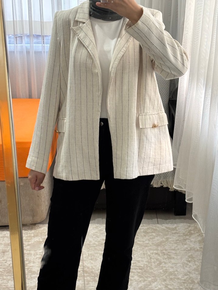 Bej renkli, çizgili keten kumaştan yapılmış, yakalı ve düğmeli, normal boyda kadın blazer ceket. Ofis kullanımı için uygundur.
