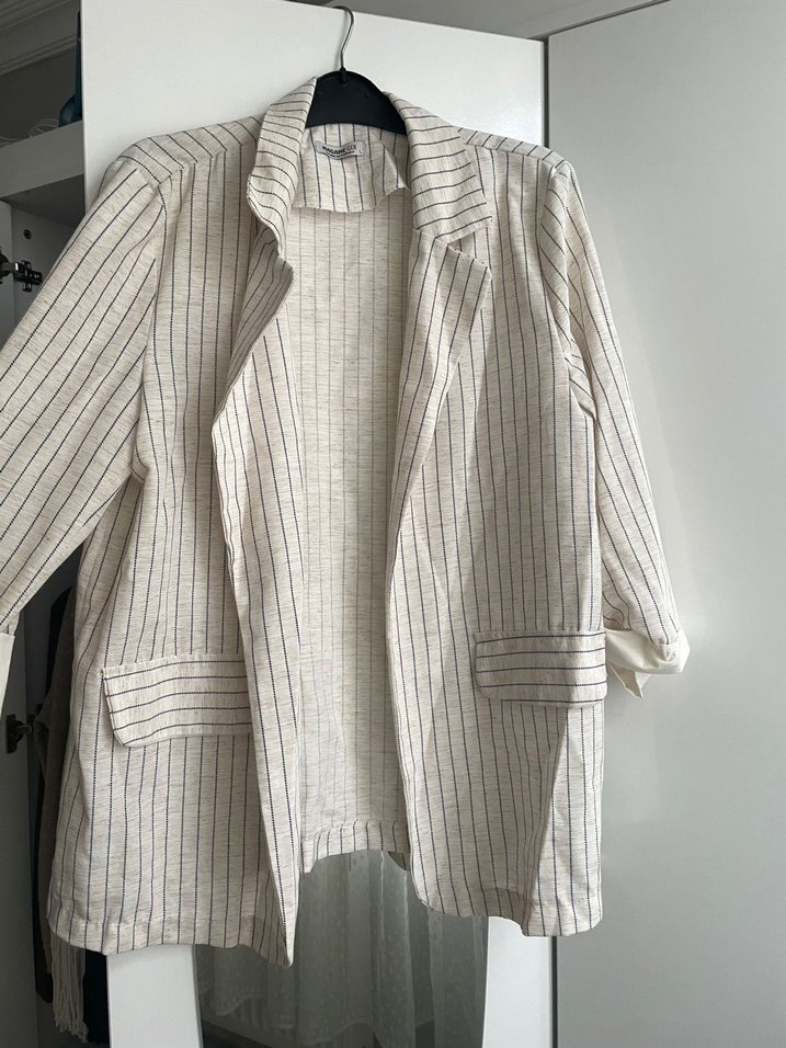 Bej keten kumaştan, çizgili desenli düğmesi yok cepleri yalancı cep yazlık sıcak tutmuyor tesettüre de uygun ama çok uzun değil bir kere giydim tertemiz bi sıkıntısı yok