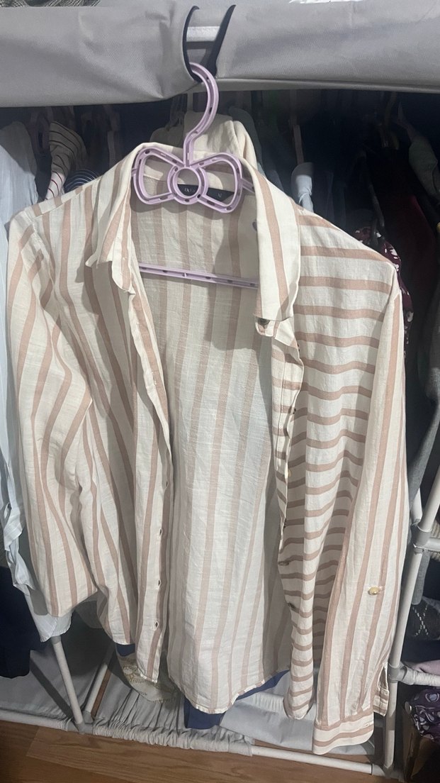 Bej çizgili keten kumaştan, uzun kollu ve yakalı kadın gömlek. Düğmeli ve rahat Paris sokak modası tarzında, bol kesim. Sorunsuzdur